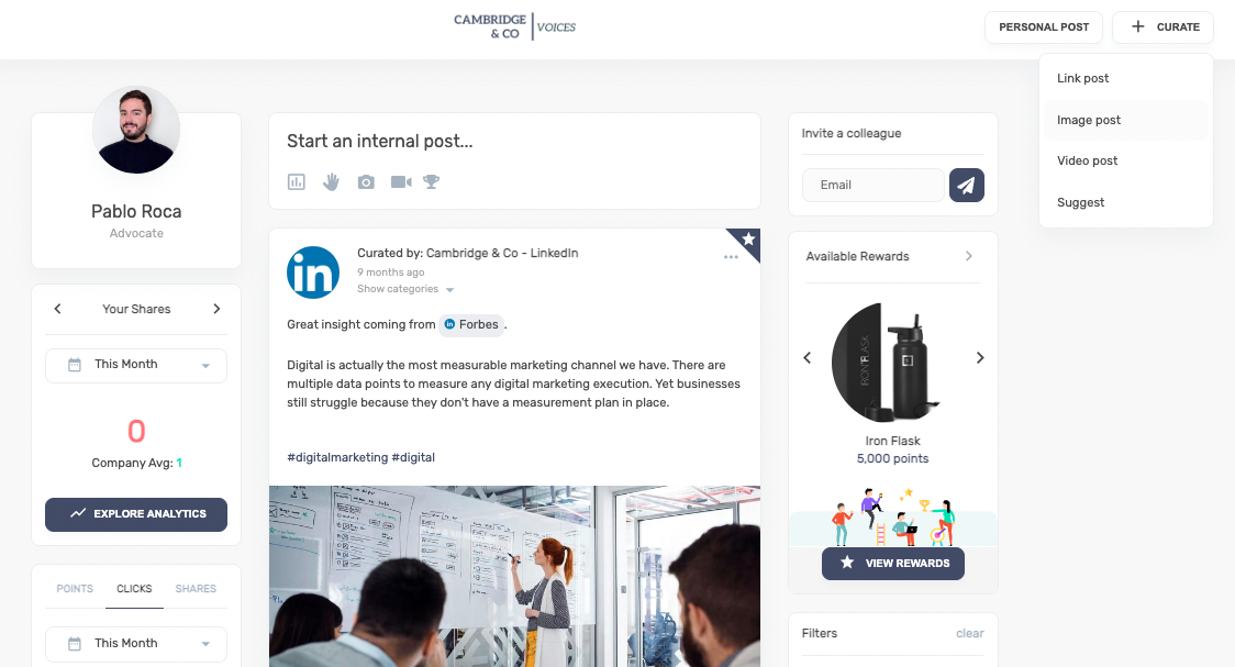 Curating images to share into DSMN8 is a great function if there is imagery you would like employees to share that doesn’t have a call to action involved. Images can also be uploaded for sharing to Instagram (See Sharing to Instagram).