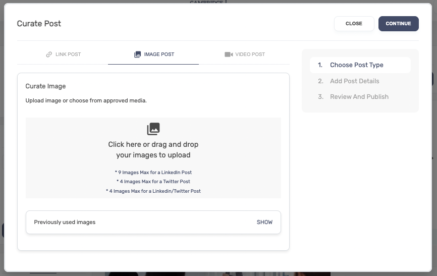 To curate an image, press the '+ curate' button and select 'Image Post'.