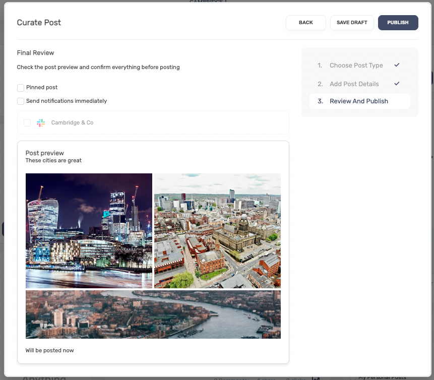 Finally, once you press continue, you will be prompted to check on the final stage "Review and Publish" how your post looks like, before making it available for your colleagues.