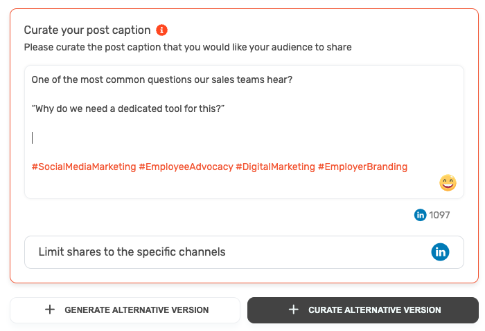 You're also able to create alternative versions of your post caption. You can do this by clicking on 'Curate Alternative Version' and writing the alternative post caption yourself or by clicking on 'Generate Alternative Version' and our AI Assistant can automatically generate new post captions for you.