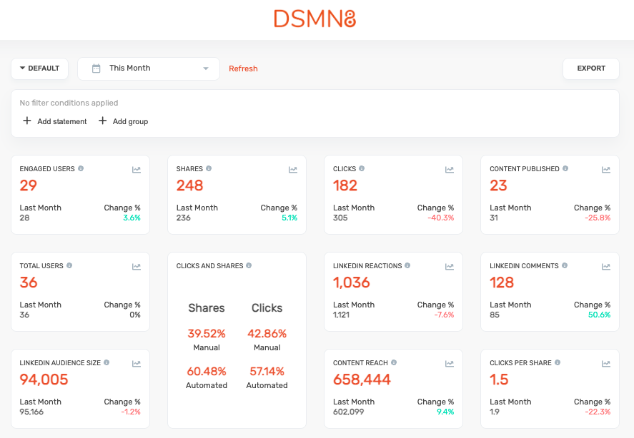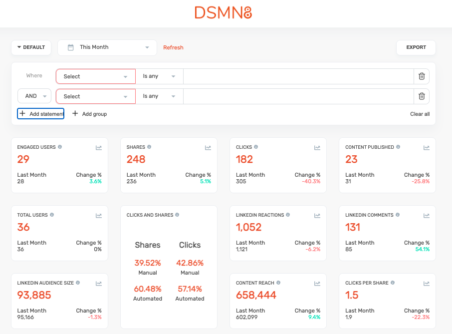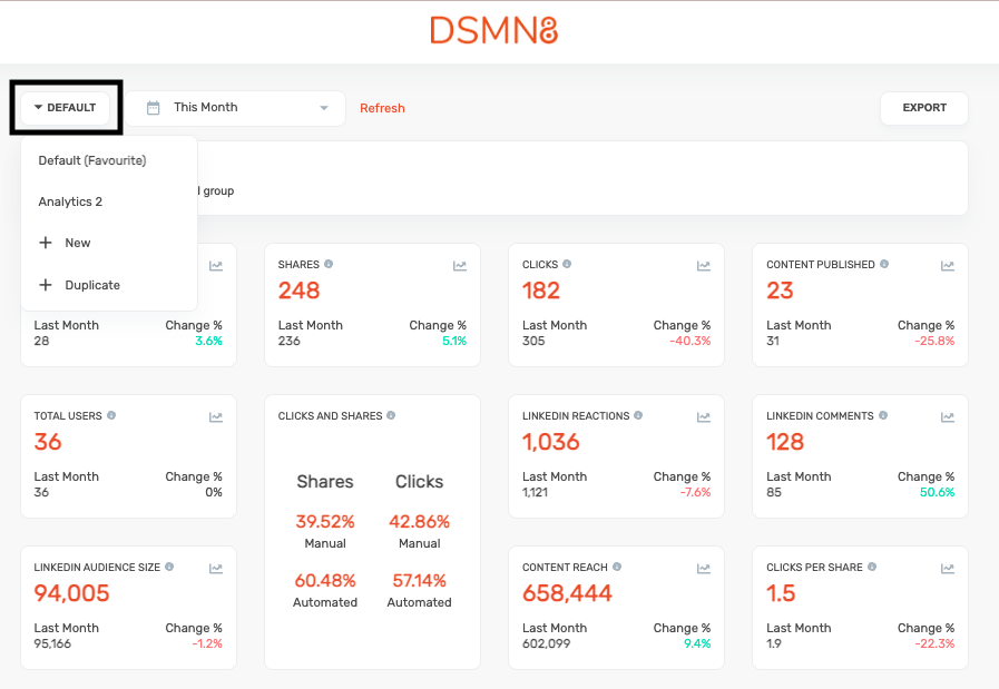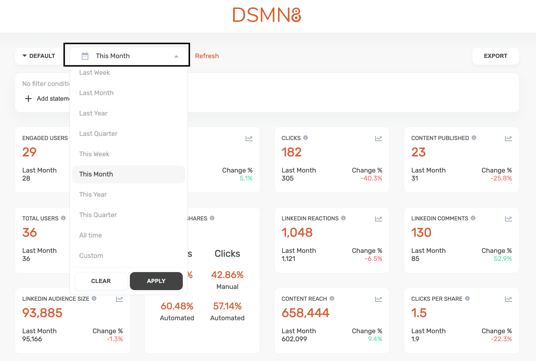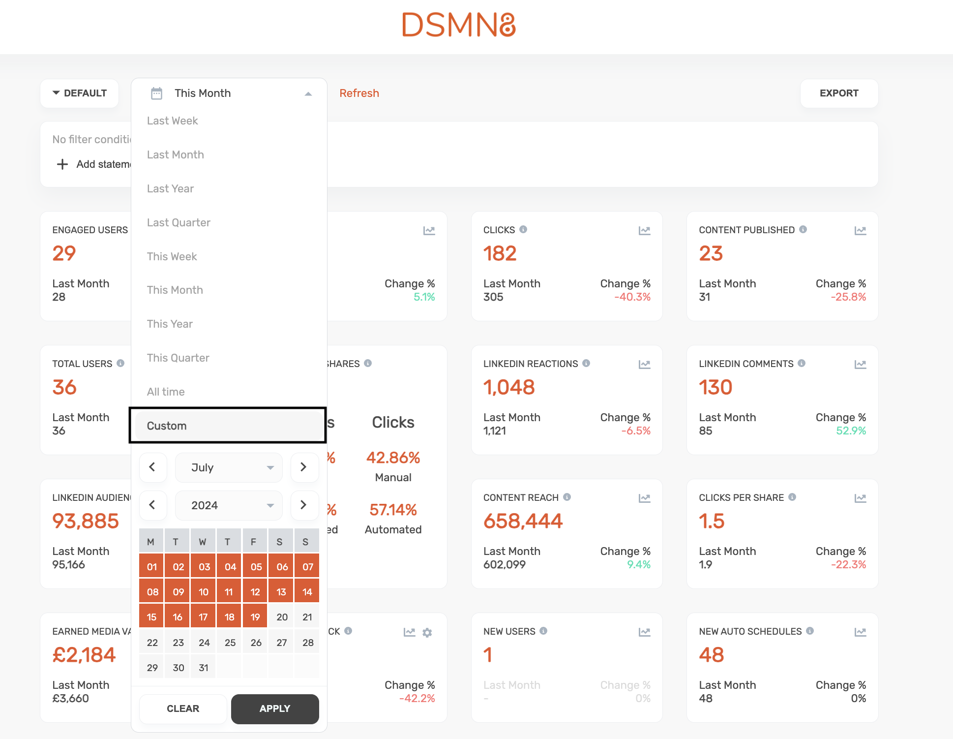 There are various ways of viewing the data within the Analytics suite. You can view how your employee advocacy program is performing by week, month, year etc. You can do this by clicking on 'This Month' at the top right-hand side of the page and it will give you a drop-down menu of how you would like to view your data.