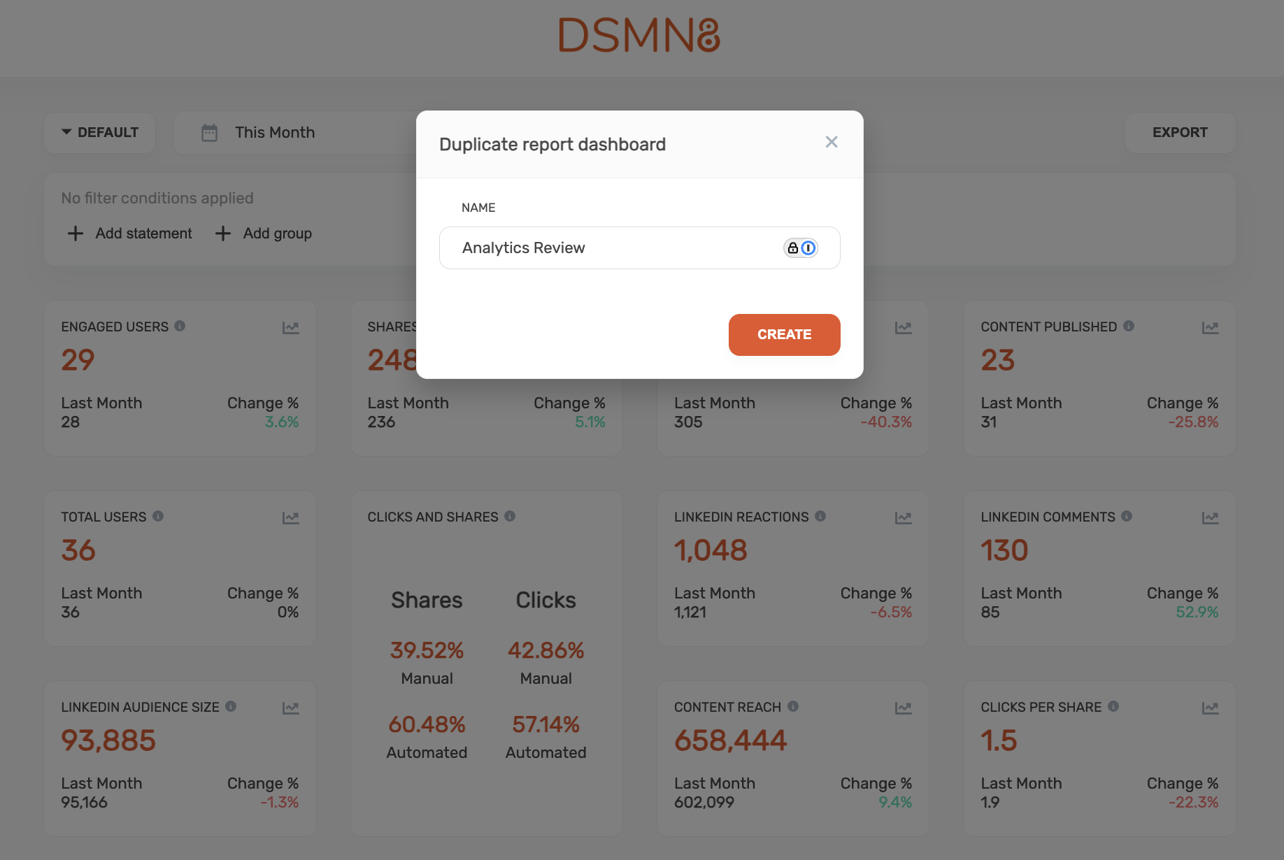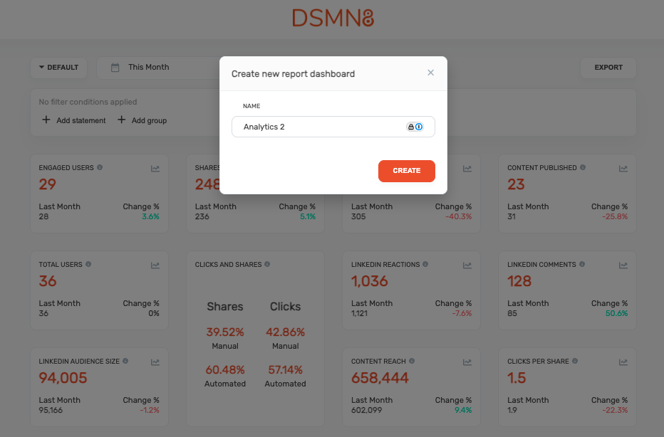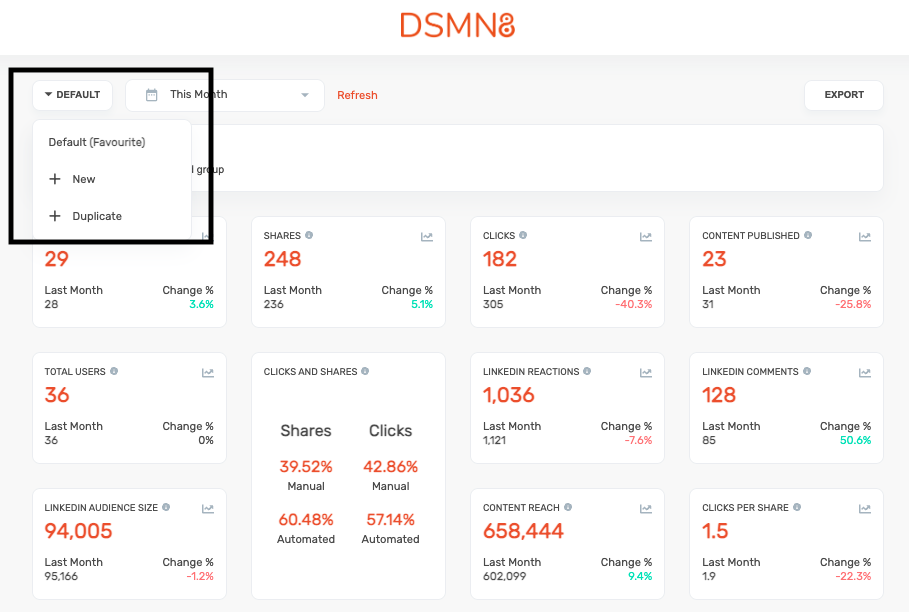 Within the analytics page, you also have the ability to create a new report dashboard or duplicate another dashboard. You can do this by clicking on the default button at the top left-hand side of the page.