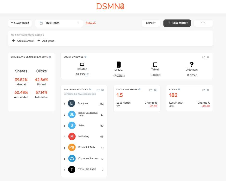 Analytics gives you a complete overview of how your employee advocacy program is performing. It enables you to track, measure and analyse your company metrics and data trends.