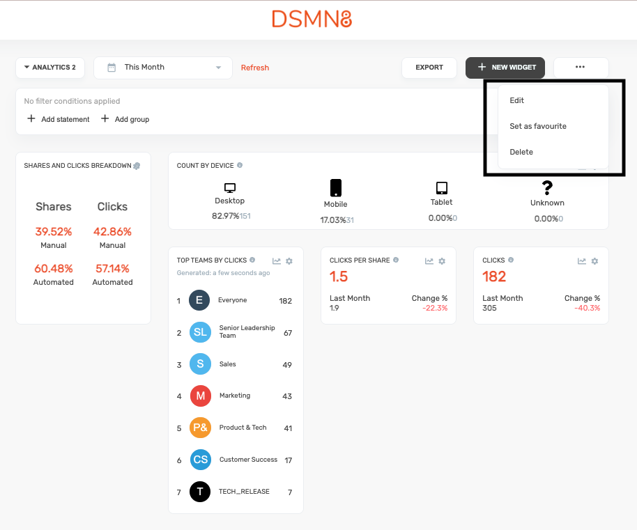 You have the ability to move the widgets, so you can choose how you would like your dashboard to be displayed. You also have the option of editing your dashboard (adding or removing widgets), setting a dashboard as a 'favourite', so that it will always show first when you open up the Analytics suite or deleting the dashboard entirely. You can do this by clicking on the three dots which can be found at the top right-hand corner of the page.