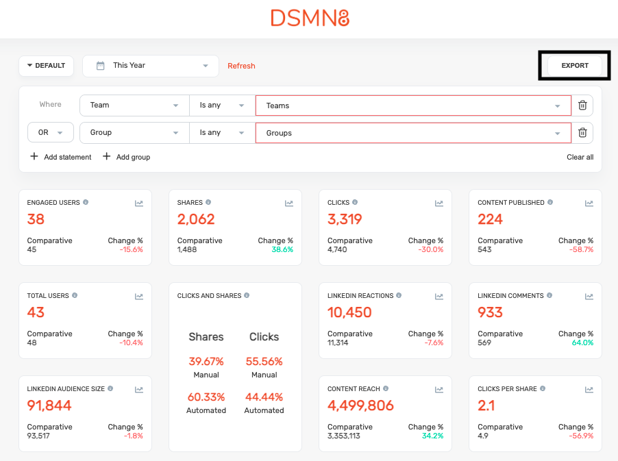 You also have the ability to view the data by teams and groups, as well as events and campaigns. You can do this by clicking on the filter button which can be found at the top of the page.