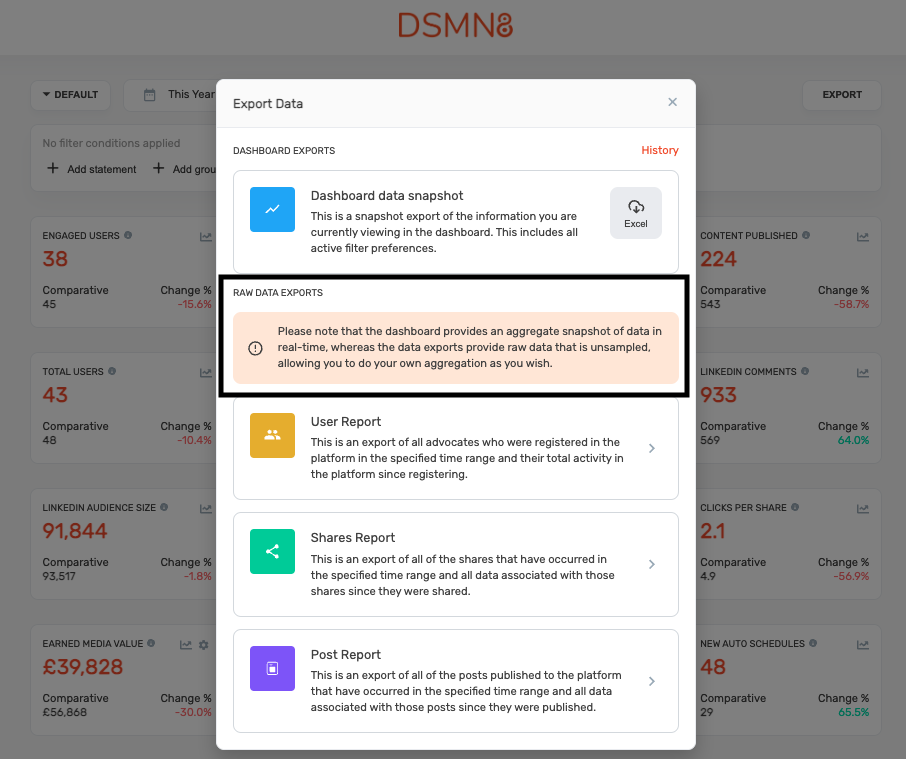 For users looking to run much more granular reporting or perhaps are looking to join these datasets with other sources, you're also able to export the raw data for Users, Shares and Posts.