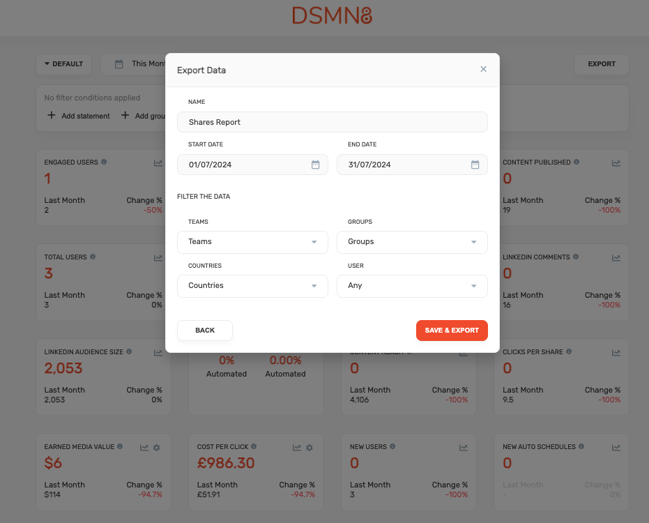 Once you have selected which report you'd like to export, you'll be able to give your report a name, set time parameters, and filter the data by Teams, Groups, Countries or Users should you wish to.