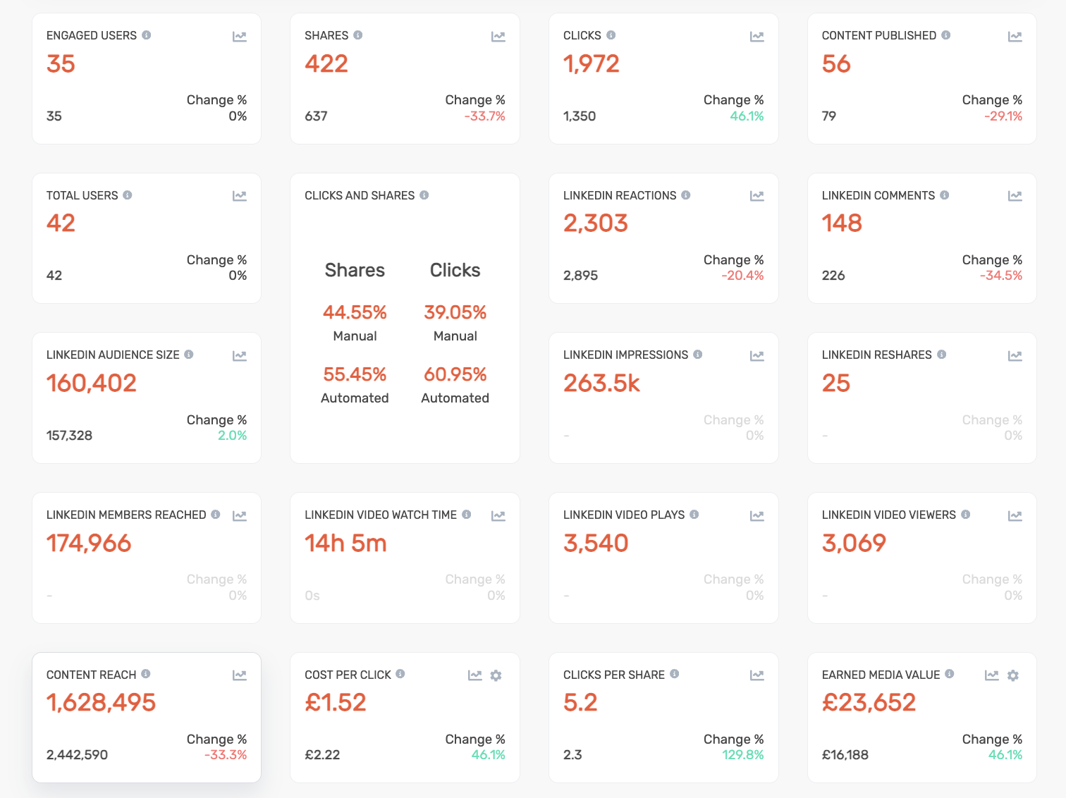 The potential reach of all content shared through the platform by registered advocates. This is calculated by multiplying the advocate audience size by the number of shares published to LinkedIn.